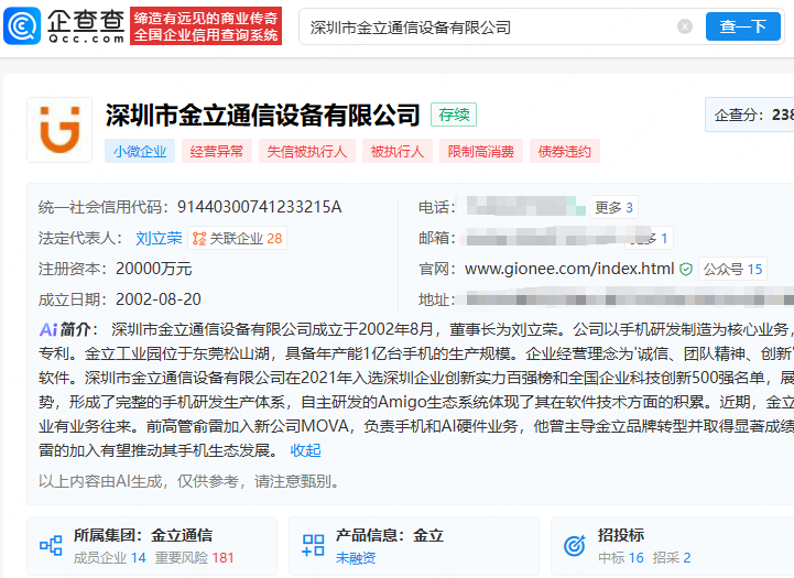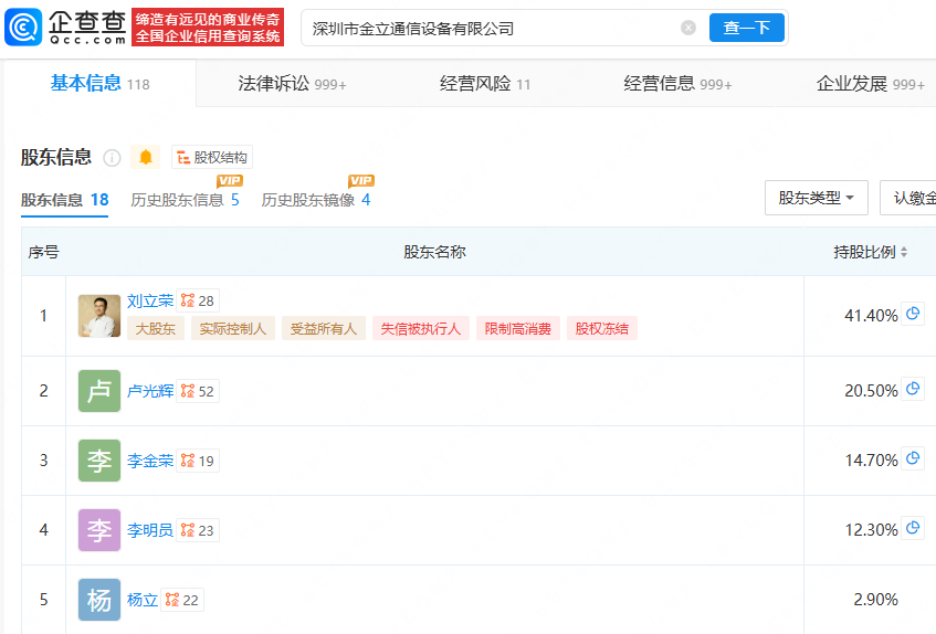 企查查APP显示,金立关联公司深圳市金立通信设备有限公司成立于2002年,法定代表人及大股东为刘立荣。该公司共有6家分支机构,目前均已吊销或注销。此外,该公司分别于2022年、2025年被深圳市市场监督管理局福田监管局列入经营异常名录,其目前现存多项限制高消费信息。