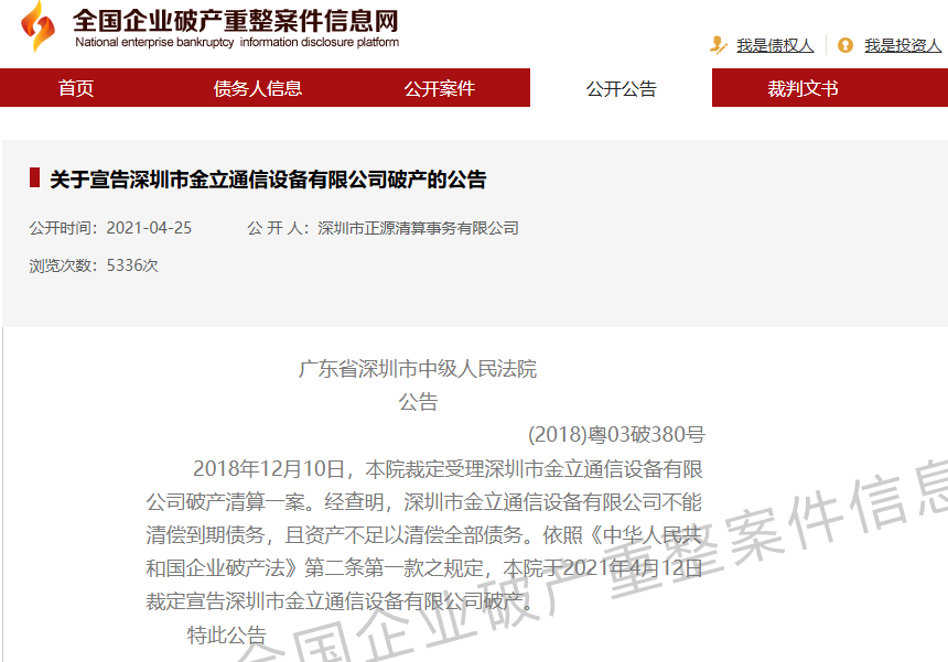 2018年12月,深圳市中级人民法院正式受理债权人提出的对金立的破产清算申请。经法院审定,截至2018年12月31日,金立的账面资产总额约为85.38亿元,清查后的资产总额约为38.39亿元,债权总额为173.59亿元,负债达近211亿元。