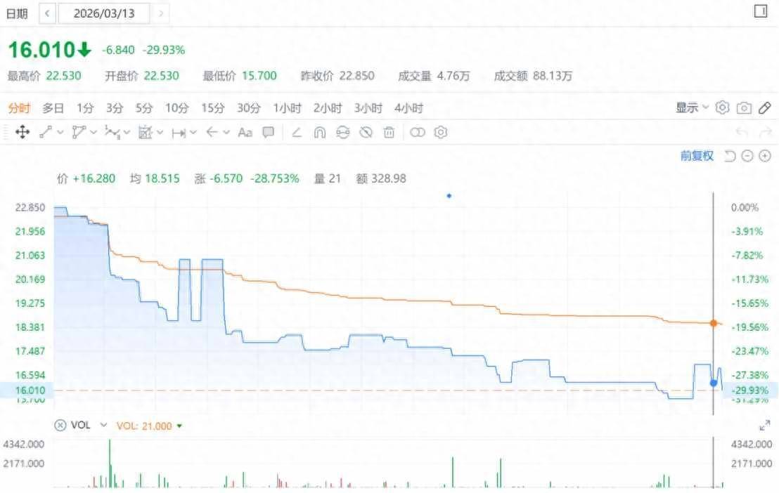 智通财经APP观察到,在3月13日盘前发布25Q4财报后,燃石医学股价便迅速走低,并在半小时后大幅跳水,股价迅速下探至日均价线以下,跌幅超过10%,而后虽有2次反弹,但多头势力被连续压制,以致当日早盘后段至收盘,燃石医学盘面基本被空头势力牢牢把控,股价也持续远离日均价线,最后收跌29.93%。