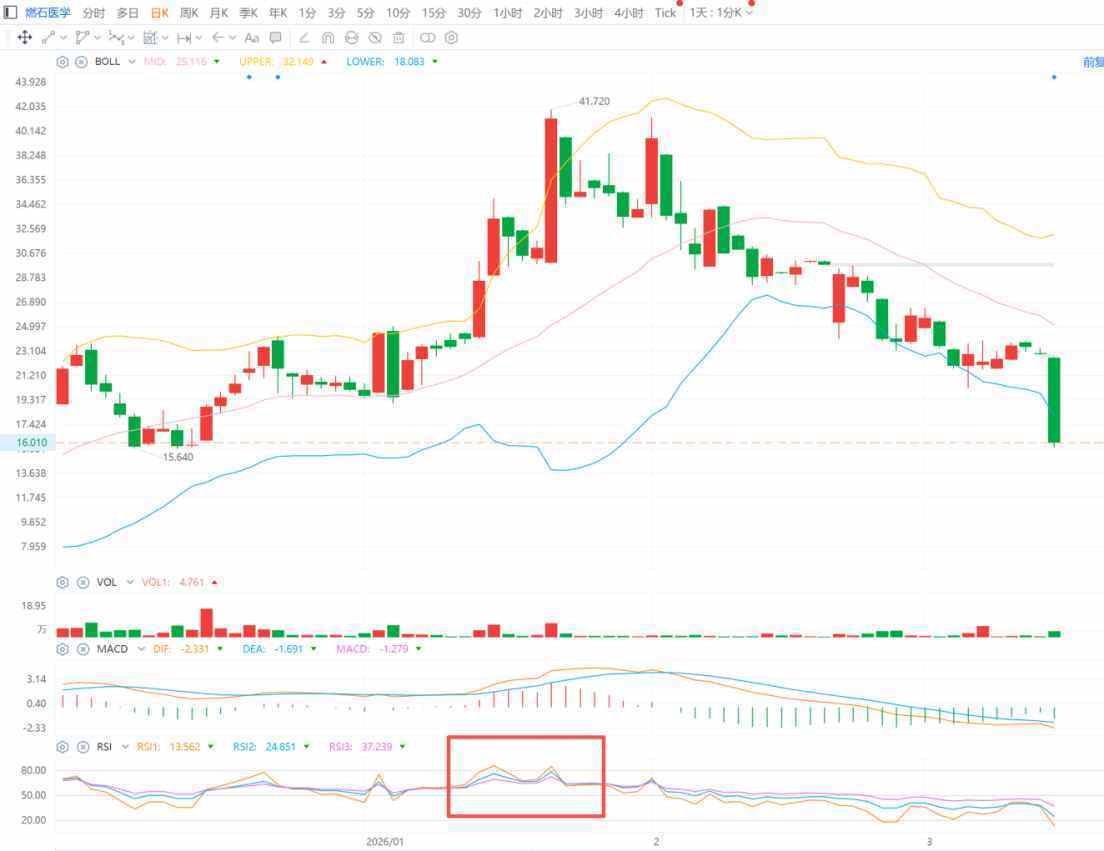 此时,燃石医学股价沿BOLL线上轨运行已持续近半个月,而其对应RSI指标分别在1月15日和1月22日两度超过80,在80超买指标线以上形成M头形态,向下反转信号已十分明显。