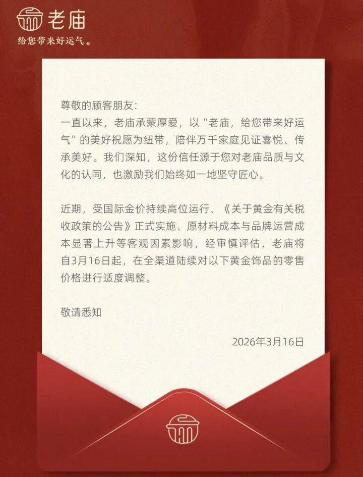 今天,老庙黄金发布公告,因为受原材料成本与品牌运营显著上升等因素影响,将于3月16日起,在全渠道对黄金饰品的零售价格进行适度调整。