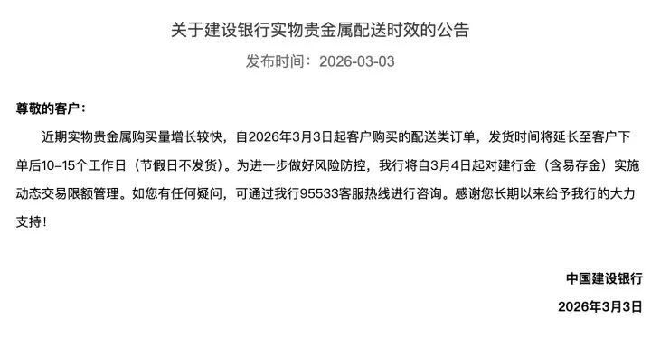 3月3日,建行发布公告称:因为实物贵金属购买数量增长较快,自3月3日起客户购买的配送类订单,发货时间将延长至客户下单后10-15个工作日(节假日不发货)。同时为了进一步做好风险防控,我行自3月4日起对建行金(含易存金)实施动态交易限额管理。