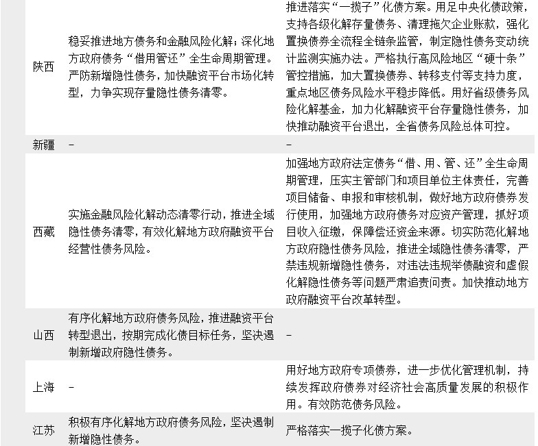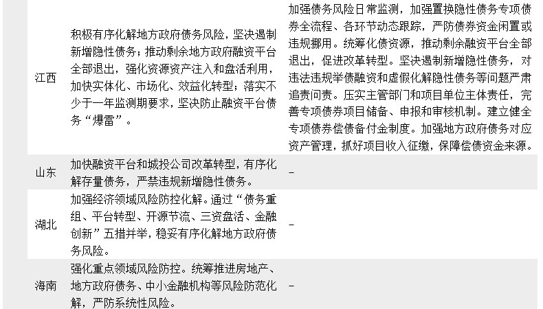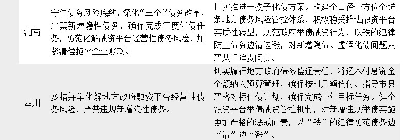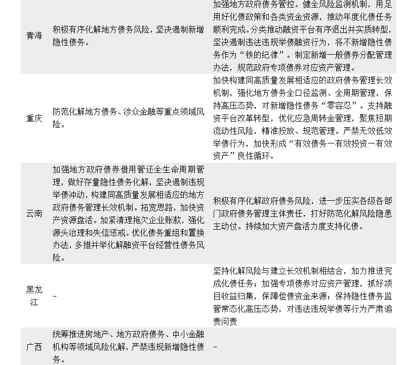 五是,多措并举化解城投经营性债务风险。比如云南提到要“多措并举化解融资平台经营性债务风险”,西藏提出要“有效化解地方政府融资平台经营性债务风险”等。