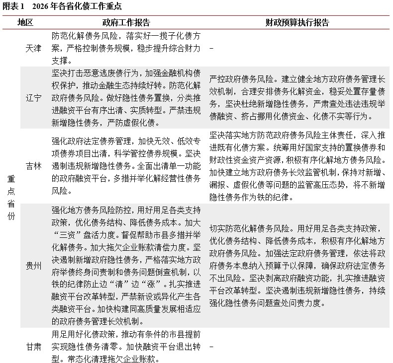 三是,首次提出化解城投经营性债务。2025年底中央经济工作会议首次提出,要优化债务重组和置换办法,多措并举化解地方政府融资平台经营性债务风险。与隐性债务由政府负有偿债义务不同,城投经营性债务是城投企业市场化经营过程中所形成的债务,需由城投企业自身经营所得去偿还,这些经营性债务不仅规模庞大,隐藏较大风险,同时,与地方政府也存在较大的关联,城投经营性债务部分产生于企业以市场化方式参与政府项目所形成,且其偿还取决于地方政府回款。在目前隐债置换导致地方债务风险显著收敛的背景下,去年中央经济工作会议首次提出化解城投经营性债务风险,或将意味着城投经营性债务风险将成为未来重要的化债方向,城投经营性债务风险化解也将获得更多的政策支持。从地方化债来看,个别省份提到了城投经营性债务风险化解情况,比如宁夏提到2025年存量非标债务全面清零。