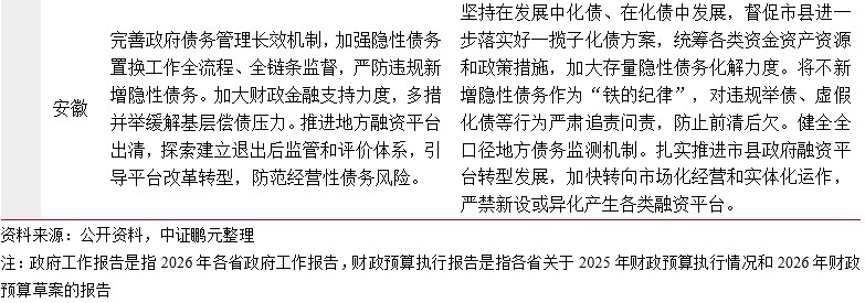 三是,推动融资平台出清。融资平台是地方隐性债务的重要载体,2025年7月30日召开的中共中央政治局会议提到,要有力有序有效推进地方融资平台出清。地方退平台有具体的时间点,融资平台要求于2027年6月底清零。目前地方退平台重点仍是剥离融资平台政府融资功能、推进市场化转型和压降平台数量。比如,甘肃提出要“加快融资平台退出转型”,安徽提出要“推进地方融资平台出清”,陕西提出要“加快推动融资平台退出”等。